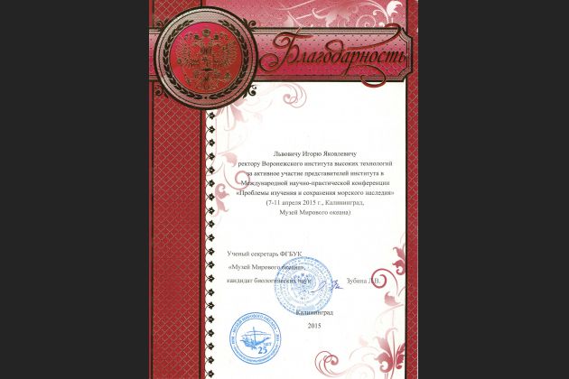 С 7 по 11 апреля 2015 г. в Музее Мирового океана г. Калининград состоялась международная научно-практическая конференция «Проблемы изучения и сохранения морского наследия». В год 25-летия Музея на представительный научный форум съехались известные ученые из одиннадцати регионов России, а так же из Великобритании, Германии, Мальты и Польши. Большинство участников конференции – сотрудники ведущих музеев Санкт-Петербурга, Москвы, Севастополя, Владивостока, Феодосии, Гамбурга, Бирмингема, Гдыни и других городов.
